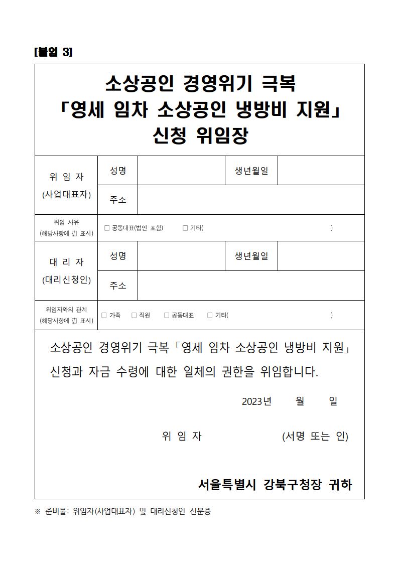 소상공인 경영위기 극복 영세 임차 소상공인 냉방비 지원 `22년 연매출이 2억원 미만이며, `23년 공고일(2023.8.8.) 현재 강북구 내 영업 중인 임차 또는 입점 사업장 - 개업일이 `23.4.1. 이전이며 공고