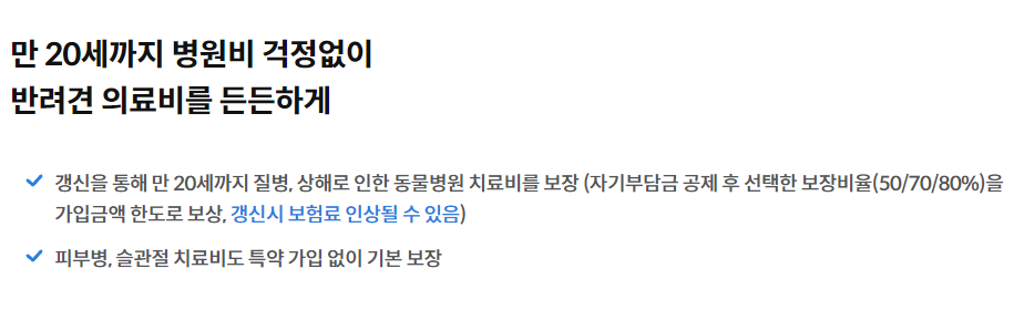 - 갱신을 통해 만20세까지 질병, 상해로 인한 동물병원 치료비 보장